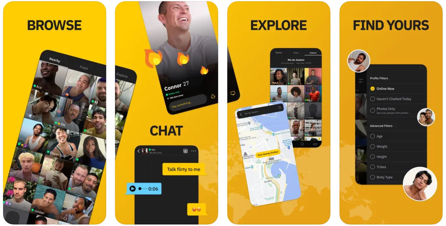 - Tribes : Les utilisateurs peuvent s'identifier à différents « tribes » (groupes) reflétant leurs intérêts et types de personnalité, tels que « Twink », « Bear », « Jock », etc.